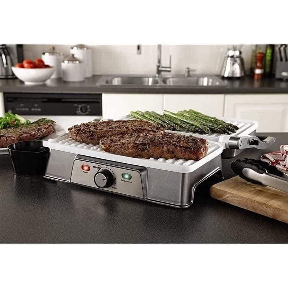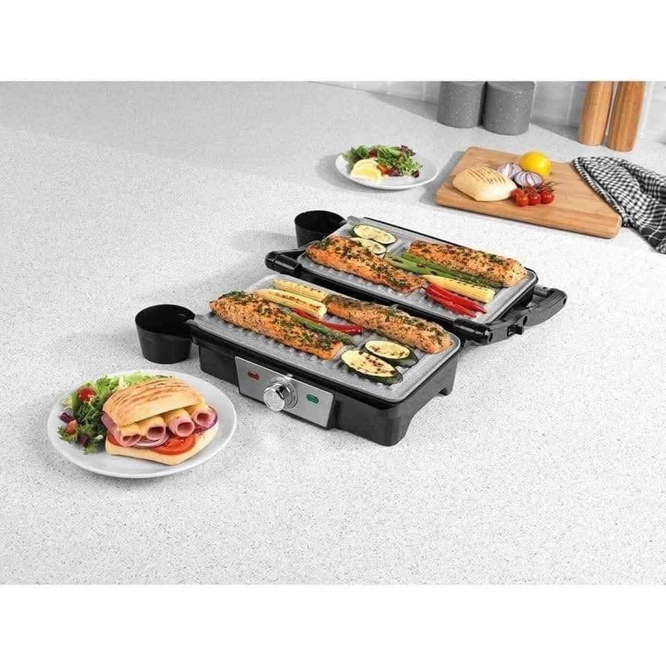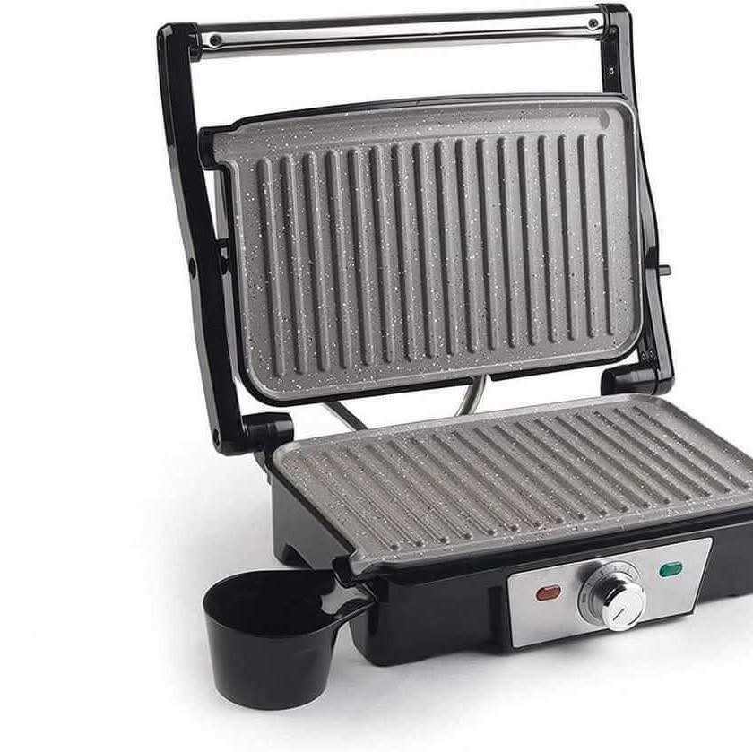 جهاز شواء متعددة الاستعمالات، بها ثلاث وظائف: يمكن استخدامها مسطحة لضغط البانيني، أو بزاوية للشواء المائل، أو بزاوية 180 درجة للخبز (الشواء) المفتوح.