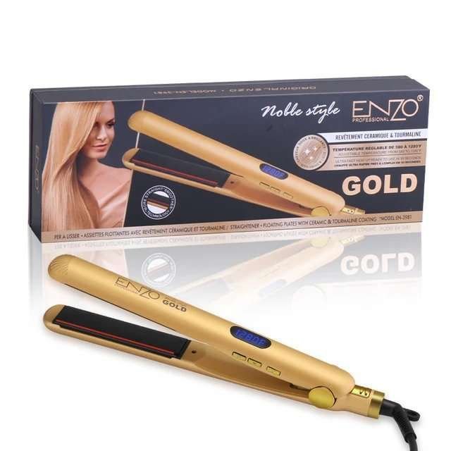احصلي على تصفيف شعر احترافي وسلس مع مكواة الشعر Enzo Hair Straightener Ceramic Titanium Gold EN-3337 المصممة للاستخدام المنزلي والصالوني.