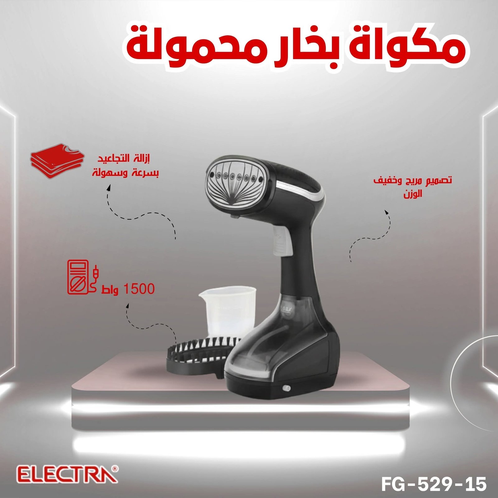 هذا المنتج هو مكواة بخار محمولة من ماركة إلكترا (Electra)، طراز FG-529-15. القوة: تعمل بقدرة 1500 واط لتسخين سريع. الوظيفة: مصممة لإزالة التجاعيد من الملابس بسرعة وسهولة. التصميم: تتميز بتصميم مريح وخفيف الوزن لسهولة الاستخدام.